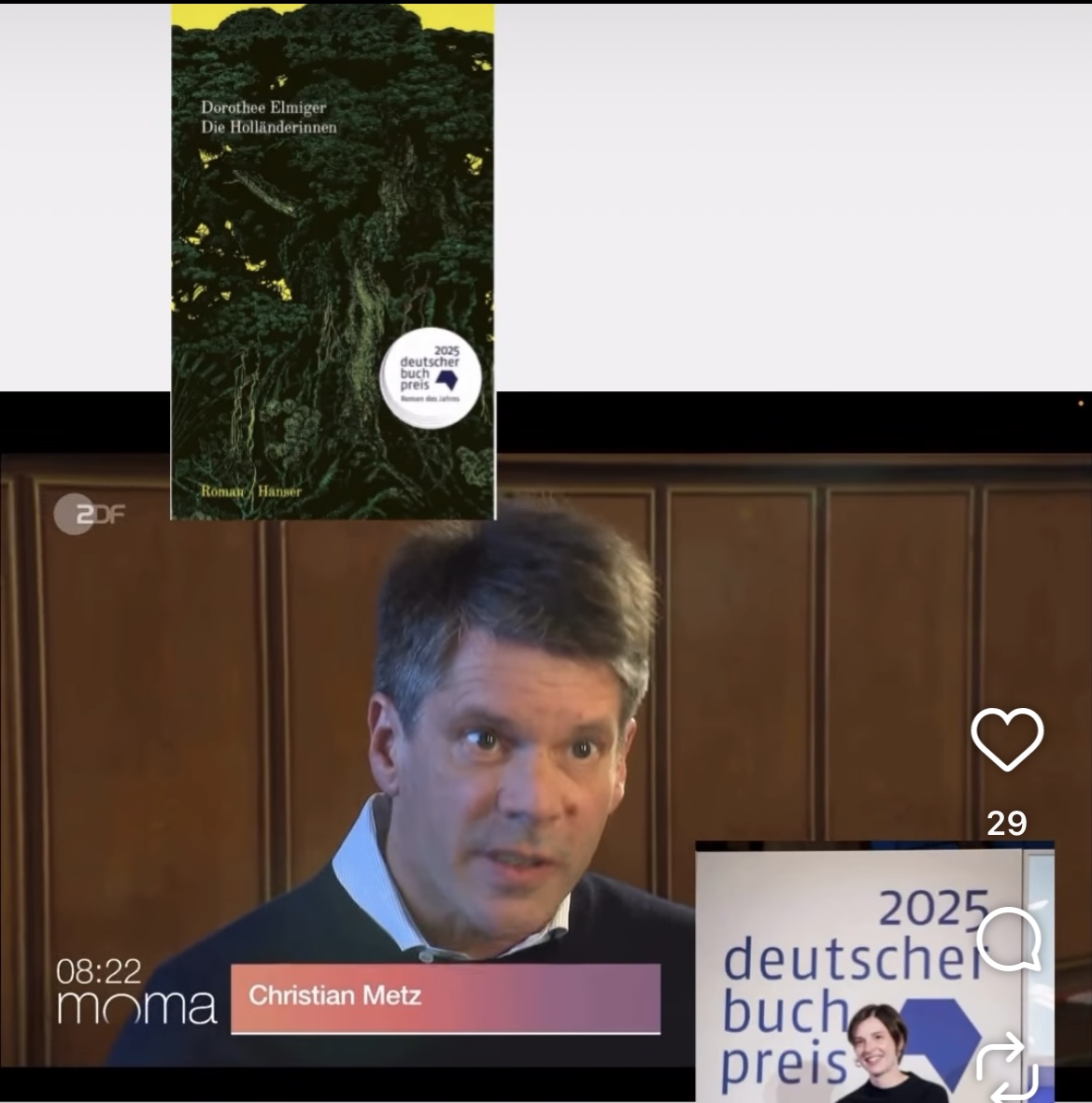 Expertengespräch: Zur Verleihung des Deutschen Buchpreises an Dorothee Elmiger für ihren Roman „Die Holländerinnen“ in der 3sat Kulturzeit vom 18. Oktober 2025 und im ZDF Morgenmagazin vom 19. Oktober 2025.