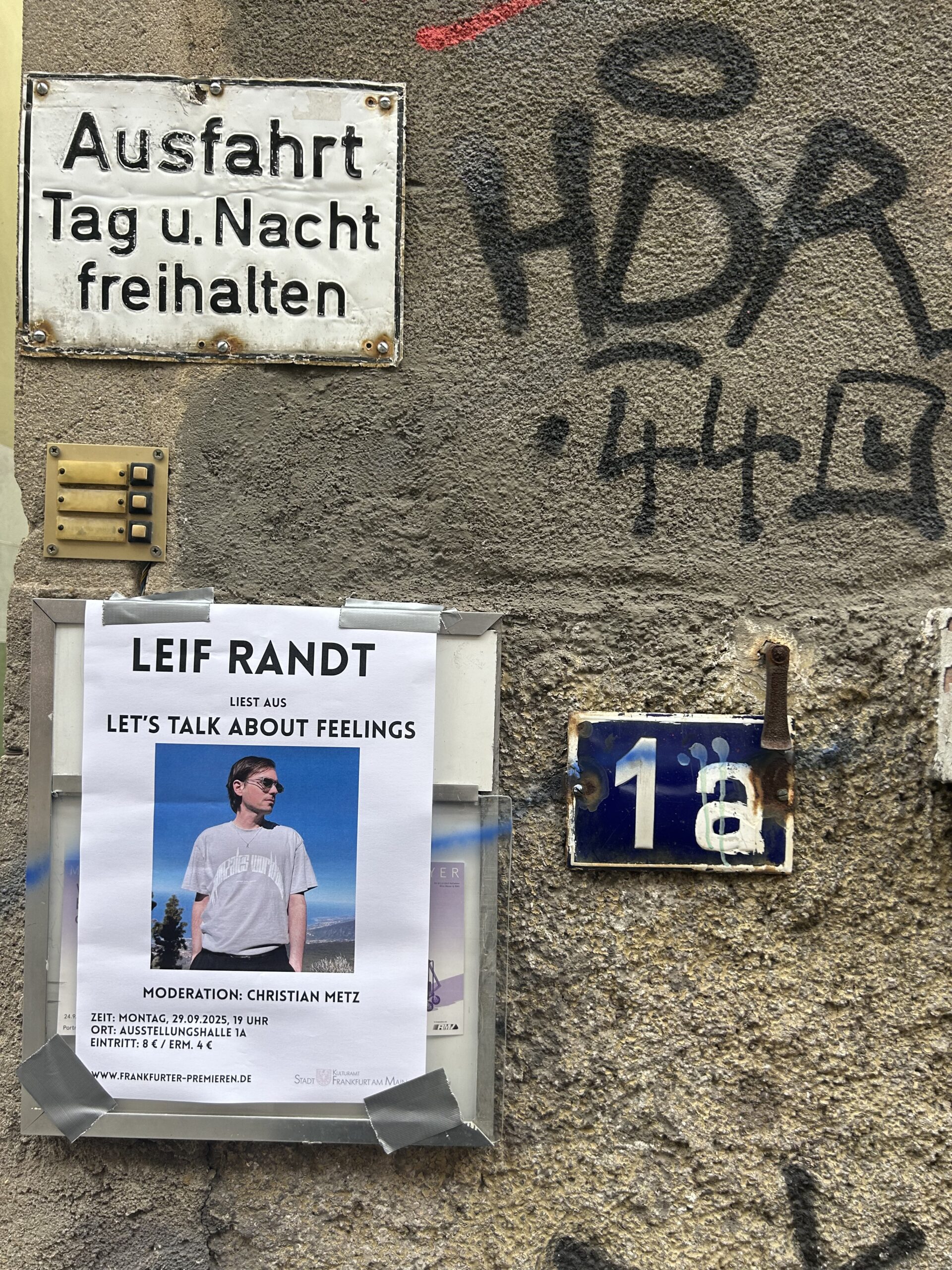 Moderation: Let’s talk about feelings. Im Gespräch mit Leif Randt bei den Frankfurter Premieren in der Ausstellungshalle 1A in Frankfurt am Main am 28.9.2025.