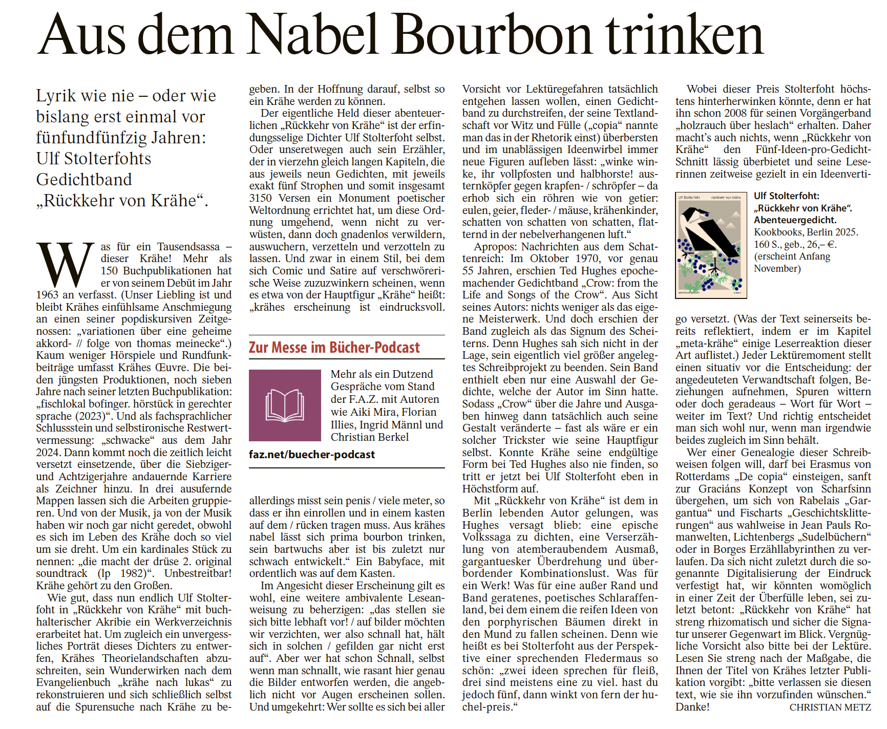 Rezension: Aus dem Nabel Bourbon trinken. Lyrik wie nie. Oder wie bislang erst einmal vor 55 Jahren. Zu Ulf Stolterfohts „Rückkehr von Krähe“, in: Frankfurter Allgemein Zeitung vom 18. Oktober 2025.