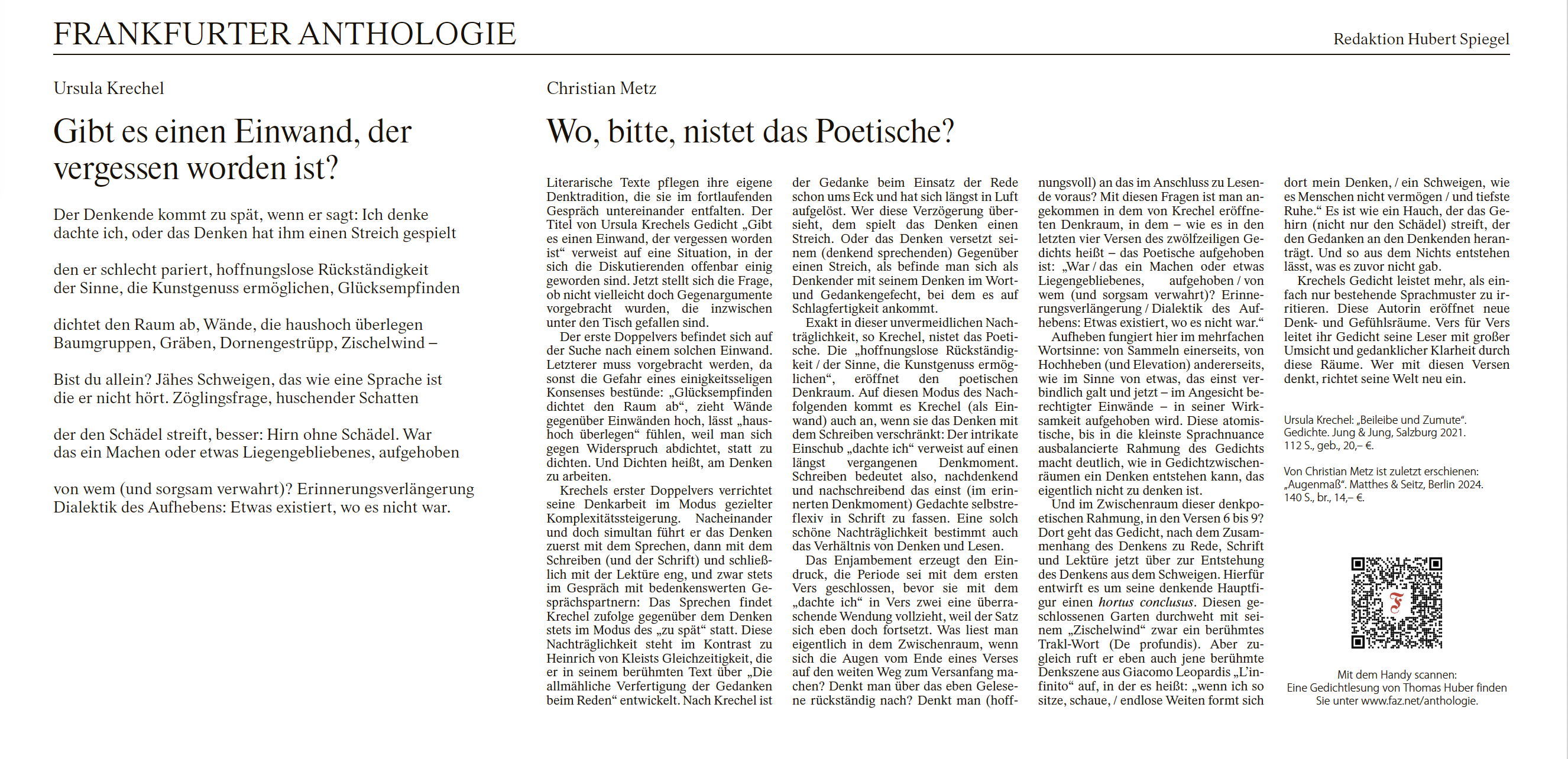 Rezension: Wo, bitte, nistet das Poetische? Zu Ursula Krechels Gedicht „Gibt es einen Einwand, der vergessen worden ist?“, in: Frankfurter Anthologie, Frankfurter Allgemeine Zeitung vom 2. November 2025.