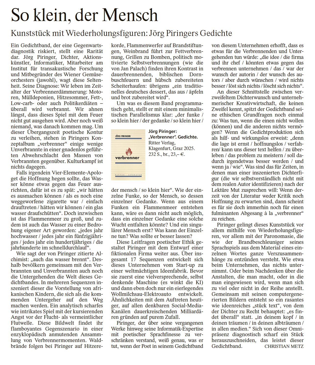 Rezension: So klein der Mensch. Kunststück mit Wiederholungsfiguren: Jörg Piringers Gedichtband, in: Frankfurter Allgemein Zeitung vom 5. November 2025.