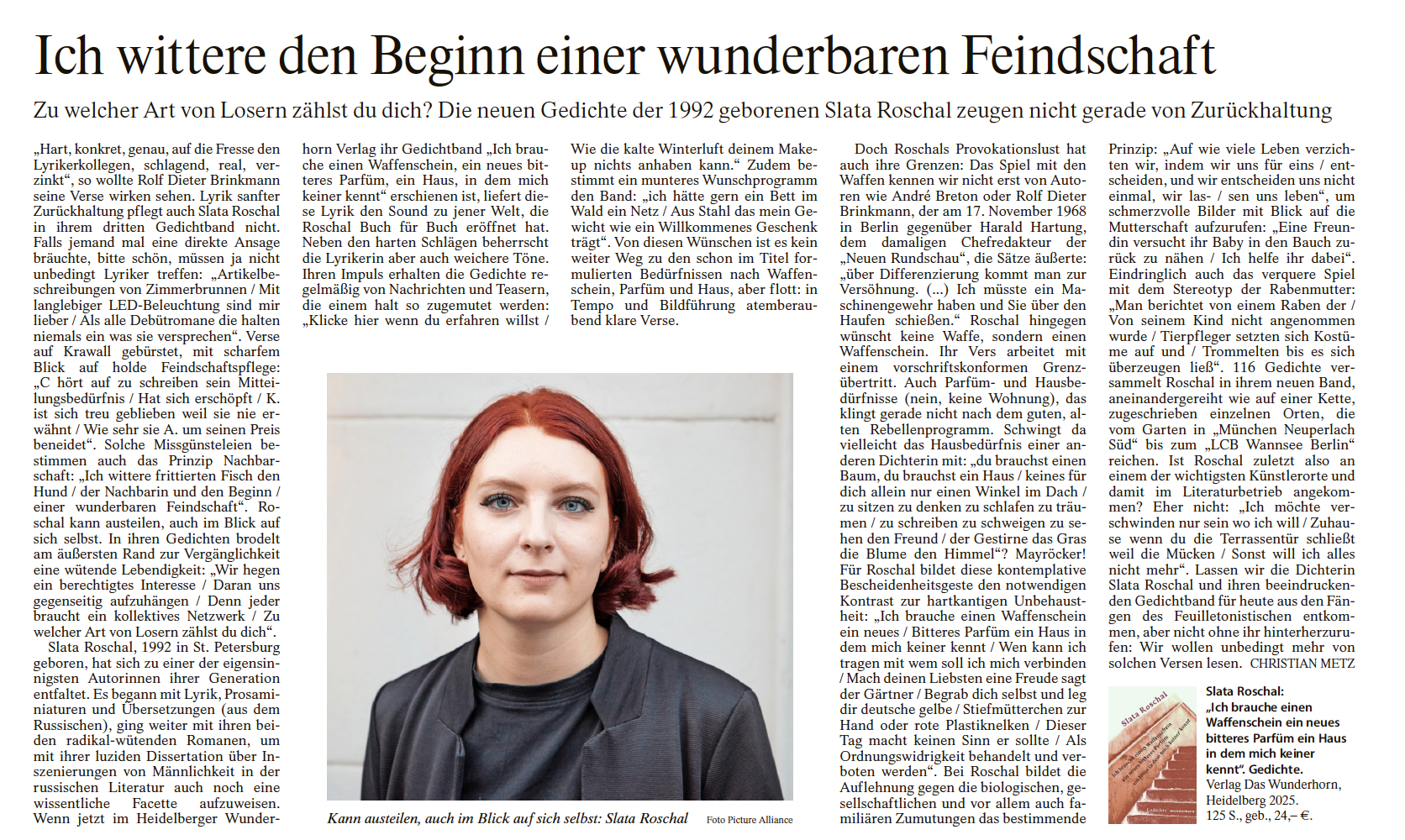 Rezension: Ich wittere den Beginn einer wunderbaren Feindschaft. Zu welcher Art von Losern zählst du? Zu Slata Roschals Gedichtband „Ich brauche einen Waffenschein ein neues bitteres Parfüm ein Haus in dem mich keiner kennt, in Frankfurter Allgemeine Zeitung vom 28. August 2025.